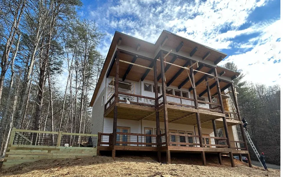 NEW CONTEMPORARY DESIGN w/Beautiful MOUNTAIN and TOCCOA RIVER VIEWS featuring City Water & Fiber Optic Internet. 5/10th mi from Horsebend Park on the Toccoa River. Huge Great Rm w/Stone Fireplace & Spacious Kitchen w/Pantry & Laundry Area. Main Level Master Suite w/Full Tile Shower, Double Vanities & Soaking Tub. (Half Guest Bath on Main). Two Guest Rms on Terrace Level w/2 full baths (One full Bdrm Suite) Wet Bar & Fireplace. Heat on Demand Hot Water & High Efficiency HVAC. Beautiful Combination of Wood & Drywall Interior. Atttached Exterior "Pad" for Firepit and Hot Tub already done. Easy Maintenance Siding & Beautiful Beam Work. Plenty of Room for a Garage attached by Breezeway. Access Roads Improved. Bring a Golf Cart or ATV for quick trips to the Park on the Widest Section of the River.