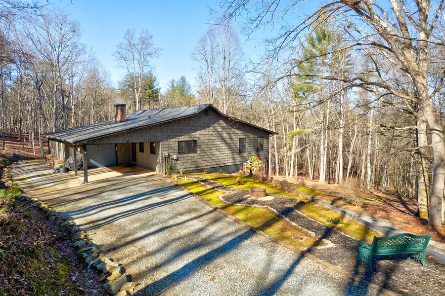 Nestled amidst the tranquil woodlands of Blue Ridge, Georgia, this captivating 2-bedroom, 2-bath vinyl shake style ranch home is a harmonious blend of rustic charm and modern living. The property, spread across a generous 5.4 +/- unrestricted acres, boasts a maintenance-free exterior that echoes the timeless allure of wood shakes, without the hassle of constant upkeep. As you step inside, you're greeted by a spacious open floor plan that unites the living, dining and kitchen areas into a seamless expanse, ideal for both cozy family nights and lively gatherings. Natural light filters through the windows, casting a warm glow across the newly remodeled bathrooms, adorned with chic fixtures and sleek finishes. A large master on the main level serves as your serene haven, offering views of the surrounding forest's peaceful embrace. The home's unique drive-thru garage, accompanied by an additional carport, provides ample space for vehicles and outdoor gear. For those who cherish hands-on creativity, the workshop area, equipped with a comforting wood stove, awaits your craft and imagination. The vast unfinished basement area offers a canvas of possibilities, ready to be transformed into your dream space. Outside, the property is a nature lover's paradise, featuring an array of fruit trees and raised garden beds.