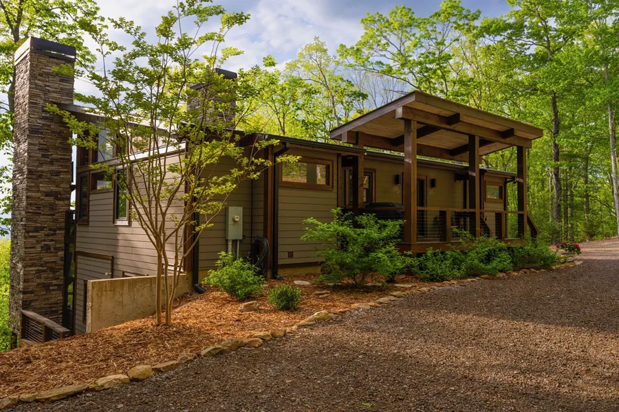 Nestled in North Georgia's serene mountain landscape, meticulously designed to blend modern aesthetics with rustic charm, this residence captivates with its vibrant, artistic interiors and breathtaking mountain vistas, Be greeted by lightly stained wood walls, complemented with vaulted wood ceilings, walls of glass, and luxury wood like flooring throughout. The open floor plan offers seamless integration from kitchen to living room providing easy flow for guest to enjoy. The kitchen is adorned with stainless steel appliances, white cabinetry, and striking teal island boasting white quartz countertop followed by a geometric tile backsplash. Center around the stack stone fireplace in the living room and gaze at the mountainous horizon through the expansive glass windows. The master suite is thoughtfully designed to include King bed, direct access to upper terrace and more large windows for...