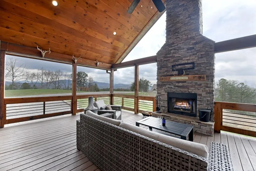 GENEROUS PRICE IMPROVEMENT!! Beautiful modern rustic 3 bedroom 2 bath home in the lovely High Meadows gated community close to Blue Ridge, Blairsville, and all area attractions. Driving into the community, you'll enjoy breathtaking long range layered mountain views, wooded forests, and rolling green pastures. This stunning home is surrounded by sweeping mountain views for miles, friendly deer passing through, and the peace and serenity of the mountains. You won't believe the views from virtually every room! Imagine warm fires, spectacular color filled sunsets, and the cool mountain evenings in any of the generous outdoor living spaces (oversized wrap around covered porches with fireplace), and custom-built fire pit. Finish up a long day by sitting in the screened in hot tub on the terrace level. Walk into the home and the first thing you'll notice is the floor to ceiling stone fireplace,...