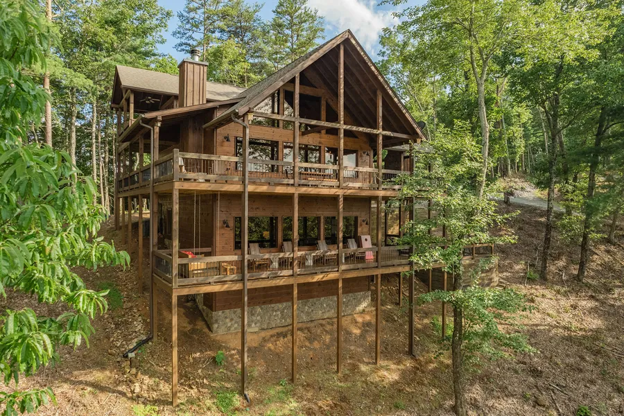 Overlooking stunning mountain ranges and with some of the best sunsets in the North Georgia Mountains, Cohutta Chalet embodies the luxury mountain experience complete with three levels of indoor and outdoor living, close proximity to Cohutta Wilderness and the Benton Mackaye Trail, sprawling outdoor space, and comfortable interior furnishings. Boasting walls of windows, soaring cathedral ceilings, a rich rustic interior, gourmet kitchen with stainless steel appliances, granite countertops and ample cabinetry. Al-fresco dining made perfect with a large dining area and doors out onto the sprawling outdoor decks perfect for entertaining. Main level living space is complimented by a large stone fireplace inside and outside on the attached party deck. Bask in the incredible long-range mountain views from all rooms in the home. The bedrooms on the main level and upper floor could be considered "primaries" with attached luxury ensuites complete with walk-in tile showers and dual vanities. On the terrace level, find a large basement den with another stellar stone fireplace, media area, billiards area, full wet bar/coffee bar, and a full bunk room with full bathroom. Terrace level deck has a large jacuzzi area, outdoor swing bed, observation area, and path to a large fire pit. Surrounded by rich wildlife all while easily accessible and minutes to Downtown Blue Ridge. The chalet is sold with an attached lot off the back of the driveway with its own separate mountain views and the perfect area to build a future garage or ADU. Sold fully-furnished and turn-key, all you'll need is your tooth brush and hiking boots. Call today!
