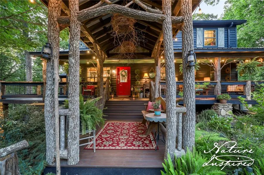 Highlands, NC architecture comes to Blue Ridge, GA! This lovingly updated mountain revival is a throwback to a more leisurely, nature inspired home with the artistry of long ago. A one of a kind rustic home which features black locust log post, mountain laurel, live edge, stone and reclaimed metals. Three levels of living areas provide plenty of space for entertaining. Enjoy the sights and sounds of nature from four covered porches with layered mountain views. A cozy screened porch has a malm fireplace, tv, and a mini bar for relaxing. The hot tub porch is an island unto itself and covered for those rainy or snowy evenings and has a live edge bar overlooking the rolling mountain views. The terrace patio is arranged for dining under the stars with grilling area. A few steps down is the large fire pit area patio area with two more dining areas. Inside, all of the mountain charm you could a...