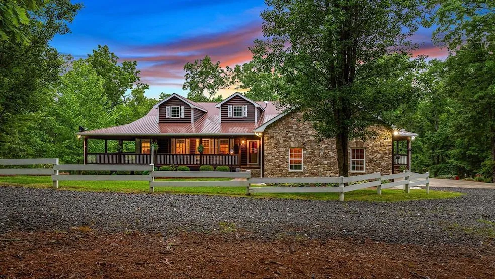 Welcome to Your Forever Home!!! This immaculately kept Log Style Lodge is perched privately within 6.91 gorgeous acres. The Peace and Serenity you feel upon driving through the lighted entry columns creates an immediate haven beyond words. The first thing you notice is the huge wraparound decks on both levels along with the beautifully landscaped lawn. Stepping inside this stunning home you're instantly surrounded by a calm as the abundance of space flows throughout this open concept floor plan. The Main level offers a very spacious living room with a vast wall of stacked stone hosting a wood burning fireplace, cathedral beamed ceilings and open to the separate Dining area and Kitchen with Island Bar. You'll also find a large pantry, Laundry Room and entry to the 2 car garage perfectly positioned off the Kitchen area for thoughtful access. Continuing through the Main level you'll notice a grand office, half bath and lovely music room. The Primary En suite offers a gas log fireplace, his & her closets and primary bathroom with a large tiled shower. The 2nd bedroom also boasts a gas log fireplace and Full Bathroom. Step onto the massive covered decks and immediately feel enveloped by the tranquility of mountain living. And we have a whole other level to discover!!! The terrace level is where you'll find another spacious living room with a gas log fireplace, 2nd Full Kitchen and a 2nd Laundry room. On one end of this level is the 3rd & 4th bedrooms with the 3rd Full bathroom. If that weren't enough, continue through to find a Media room and workout room! It just keeps getting better and better. Stepping onto the terrace level outdoor deck you're surrounded by nature. Take a stroll through the woods or just enjoy the beautiful yard. Includes a 30x40 garage on the upper portion of the property which offers RV height doors! Home being sold Furnished, green egg also stays and Polaris ranger offered separately.