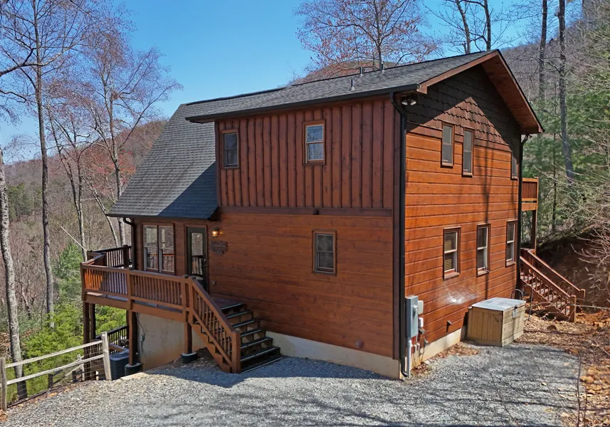The mountains are calling you to the heart of the Aska Adventure Area to this stunning cabin tucked away on a mountainside with so much to enjoy. Entering the main level, you will be greeted by stunning mountain views, outdoor seating and a screened porch with outdoor entertaining space perfect for enjoying the fireplace, TV and grilling your favorite meal. Inside the main level, you will find soaring ceilings, a stone gas log fireplace with TV and a wall of windows in the prowl front that faces the layered mountain and lake view. You will be able to spy Lake Blue Ridge in the distance, just a short drive to enjoy all the water activities this pristine lake offers. The kitchen gleams with granite counter tops, stainless appliances and a stacked stone breakfast bar. A handy half bath is just around the corner from the kitchen and primary bedroom. The main level bedroom has a king size bed, TV and private luxurious bathroom with granite counter tops and tile shower. The upper level bedroom has a beautiful king size bed, private balcony for two, a luxurious bathroom with a tile shower, double vanity granite counter top and a jetted garden tub perfect for soaking your cares away. Head down to the terrace level, where you will find a luxe great room with wet bar and a beautiful stone gas log fireplace. Enjoy your company with a glass of wine and a friendly game of pool, or use the wet bar for the perfect charcuterie display. The lower bedroom has a queen bed and custom built-in twin beds, along with a bathroom showcasing granite counter tops, and a tile shower/tub combo. Ready to enjoy the mountain air and go dancing in the moonlight? You will have a front row seat to the stars in the open air hot tub with mountains that feel so close you could touch them. The fire pit is just a few steps away along the lovely rock path, showing off cafe string lighting that twinkles in the beautiful mountain sky. Just minutes to the Toccoa River for kayaking, tubing, fishing, hiking/biking trails, local wineries and Downtown Blue Ridge.