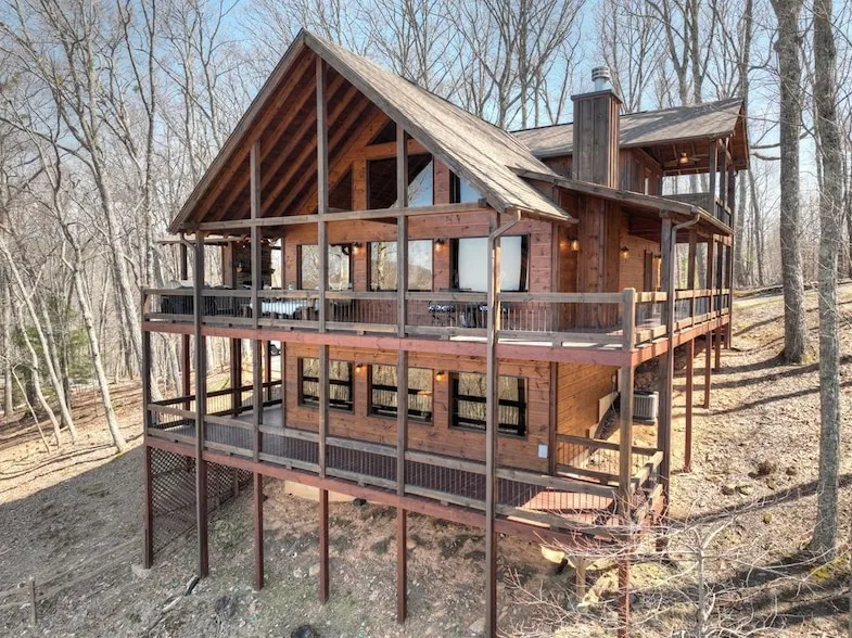 ON TOP OF THE WORLD VIEWS! This stunning 3 Bedroom, 3.5 Bathroom mountain retreat offers unparalleled, long-range views of rolling pastures and the majestic peaks of the untouched National Forest Mountains. A wall of floor-to-ceiling glass in the chalet-style great room brings the outdoors in, immersing you in the breathtaking scenery from every angle. Three-sided covered porches complete with a wood-burning fireplace and cozy furnishings, the perfect spot to unwind and soak up the scenery that brings so many to the Blue Ridge Mountains! Inside, the great room features a stoned, gas fireplace, elegant built-in cabinetry, and an inviting open-concept design. The gourmet kitchen is a masterpiece with popular circle sawn cabinetry, an L-shaped island with raised bar for seating, lighted glass displays, a custom vent hood, granite countertops, a pantry, and unique tile backsplash all beautifully illuminated with under-cabinet lighting. A spacious dining area ensures room for the whole family. From each space, you'll feel the mountains wrapping their beauty around you. The main-level master suite offers private access to the covered porch, while the luxurious master bath features a custom slate shower and vanity with granite countertops. A half-bath for guests complete with easy access, main level laundry closet. Follow upstairs to an open loft, where you'll find a a workspace with a million-dollar view. The second master suite offers a private porch, custom built furnishings, a walk-in closet, and a spa-like bath with double vanity, jetted tub, and tile shower, all bathed in natural light. The terrace level boasts a secondary family room with a stoned, gas fireplace, rec area and an extended wet bar. Third bedroom features custom bunks with four twin beds all w/ built-in lighting, complete with a 3rd bathroom. Fenced doggie area! Would make the perfect STR or getaway home! Fully Furnished! You don't find Views like this anymore!!! Make this your dream home today!!