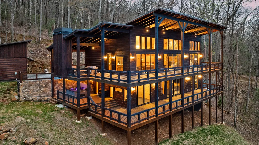 This stunning 4BR/3.5BA mountain modern home is the ultimate escape into the beauty of the Blue Ridge Mountains. Designed to capture the awe-inspiring long-range, multi-layer mountain and sunset views, every inch of this home brings the outdoors in. Step into a dramatic foyer with a wall of windows framing panoramic vistas. The great room features soaring ceilings, a stacked stone gas-log fireplace, and flows into a spacious dining area perfect for entertaining. The custom kitchen is a chef’s dream—granite countertops, stainless steel appliances, ample pantry space, and a clean, modern aesthetic. The primary suite is a serene sanctuary with its own wall of windows, luxurious tile shower, and an oversized soaking tub. Step outside onto the immense deck, where an exterior fireplace creates the perfect setting to relax or host under the stars. The terrace level offers a game/media area with a wet bar, three additional bedrooms, two full baths, and another expansive deck complete with a hot tub—all overlooking jaw-dropping mountain ranges. Additional features include a two-car garage, ample storage, and high-end finishes throughout. Just minutes from downtown Blue Ridge, you are close to top-rated dining, boutique shopping, and endless outdoor adventures—hiking, fishing, boating, and more. This is more than a home—it is your dream mountain getaway.