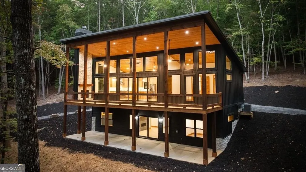 Stunning New Construction Mountain Modern on just over 4 private acres! This home offers the perfect balance of privacy, modern design, and mountain charm. From the welcoming covered porch, step into an open-concept living space with soaring windows and oversized sliders that fill the home with light and capture serene forest views. The great room centers around a sleek modern fireplace with stylish lighting, while the chef's kitchen features a 36-inch gas range, gold accents, a large island, and a spacious walk-in pantry. The dining area, framed by dramatic fixed-glass windows, creates a seamless connection to the outdoors. The main-level primary suite is a private retreat with a custom accent wall, reading sconces, walk-in closet with washer/dryer hookup, and spa-inspired bath with dual vanities and a striking tiled shower. Just outside, a covered porch with a wood-burning fireplace invites you to relax and soak in the peaceful setting. A half bath completes the main level. Downstairs, the terrace level offers even more space to entertain with a cozy gas-log fireplace, wet bar with wine cooler, and storage under the stairs. Two guest bedrooms (one with en suite), a bunk room, and a third full bath with tiled tub surround provide plenty of room for family and friends. The lower-level patio is ideal for a hot tub or outdoor lounge. With usable acreage, and ample parking, this home is as functional as it is stylish. Whether you're looking for a luxury rental investment or a private mountain escape, this property delivers it all.
