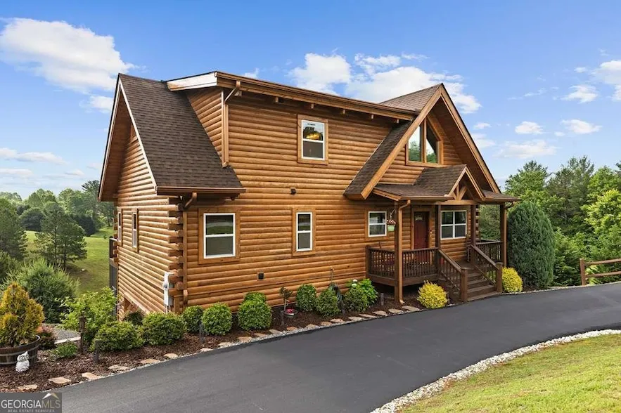 Escape to the tranquility of Emelia Estates, a haven for nature lovers offering breathtaking mountain vistas, pond views, and abundant wildlife right in your backyard. Nestled on a wooded cul-de-sac lot, this charming 2-bedroom, 3-bath cabin (with easy potential for a third bedroom!) provides the perfect balance of seclusion and convenience-just minutes from Blue Ridge, Blairsville, and SR 515. Step inside to an inviting open floor plan adorned with tongue-and-groove woodwork, hardwood floors, and a stunning stacked-stone gas fireplace that creates a warm and cozy ambiance. The kitchen features granite countertops and new stainless steel appliances (2023), while the bathrooms and laundry room showcase unique custom live-edge wood countertops. The fully finished basement is a versatile space, ready to transform into a third bedroom, a game room, or a home office. The spacious master suite boasts a walk-in closet, additional storage, a private balcony, and a beautifully tiled walk-in shower with a double vanity. A Juliet balcony provides a lovely office nook, while the main-level bedroom offers sliding doors to the deck, a double closet, and a full bath with a double vanity for added convenience. Outside, enjoy two back decks, a screened porch, a fire pit, and a circular paved driveway surrounded by elegant rock landscaping. With low HOA fees ($300/year), community water, and a drive-under garage featuring a workbench and storage, this home delivers the best of mountain living with timeless D-log cabin construction. Is this retreat the peaceful getaway you've been searching for? Back on the Market, no fault of the seller!!