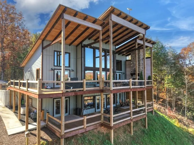 Welcome to this stunning mountain retreat, where elegance, comfort, and breathtaking views come together in perfect harmony. This beautiful Mountain Modern home features three spacious bedrooms, three and a half bathrooms, and an abundance of thoughtful upgrades throughout. Step inside to an inviting open-concept living area highlighted by gleaming wood floors, a cozy gas fireplace, and expansive windows that frame panoramic mountain vistas. The gourmet kitchen is a chef's dream, boasting granite countertops, upgraded stainless steel appliances, and a large pantry for all your storage needs and a laundry on each level. Each bathroom exudes craftsmanship and style, with beautiful tile work, granite countertops, a bar on terrace level and a custom wood-crafted vanity in one of the baths for a touch of rustic charm and a huge terrace level storage/closet room. This home offers gas fireplaces on each level for cozy gatherings, and a wood-burning fireplace outside—perfect for entertaining under the stars. Enjoy the outdoors from not one, but two expansive decks plus an additional party deck, all designed to take full advantage of the spectacular mountain scenery. Downstairs, the terrace level features luxury vinyl flooring, a second living area, and space ideal for relaxation or recreation. There's also a dedicated office, perfect for remote work or creative pursuits. Additional features include beautiful designer light fixtures, a two-car carport, paved road access, and plenty of space to entertain, unwind, and enjoy mountain living at its finest. Whether as a full-time residence or a vacation getaway, this home offers the perfect blend of luxury, warmth, and natural beauty—a true mountain masterpiece.