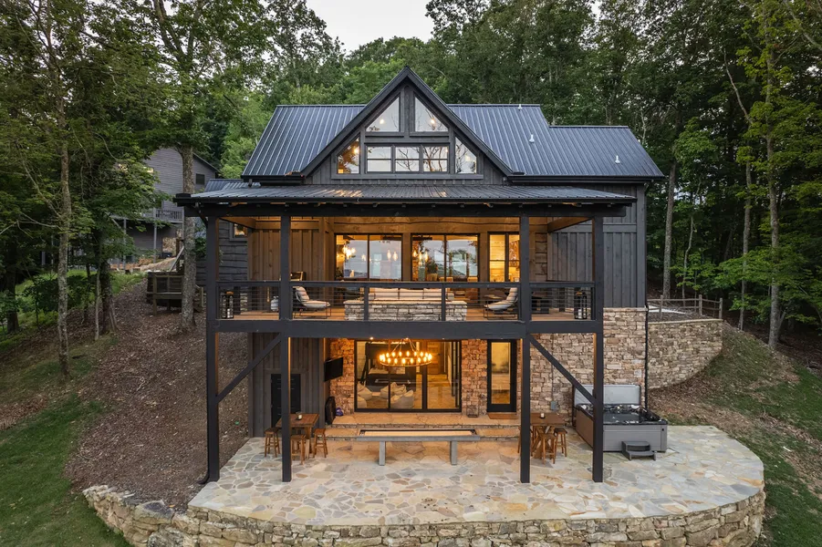 An ethereal mountain retreat -- welcome to Stags Manor! Overlooking panoramic layered mountain views, lush U. S. National Forestry land, and some of the best sunsets in the North Georgia Mountains! This rustic-contemporary blend chalet beckons luxurious mountain living with a gourmet kitchen, Viking kitchen appliances, custom concrete countertops, custom stone masonry work, chef's kitchen eat-in island and large open-concept dining area, comfortable living room, and the focal point of the main level: a four-sided fireplace! Glass sliders open up to the most luxurious covered deck with a custom linear fire table, outdoor grilling area, comfortable seating, and views across the horizon. The main house is complete with an upstairs primary bedroom with in-room laundry, a large coffee/wine bar, office, and ample custom storage. The terrace level has a large bunk room, fireplace, large bathroo...