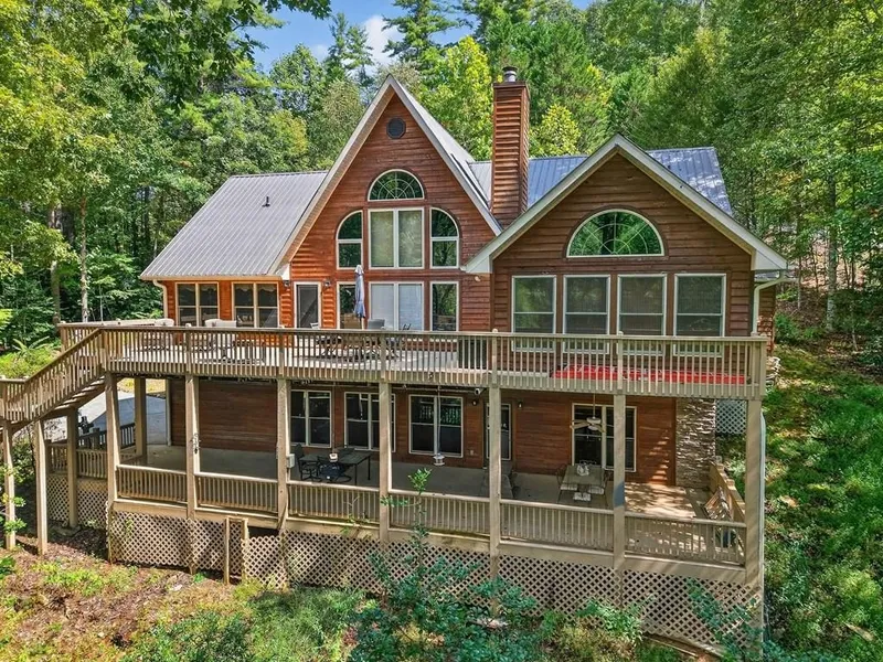 Situated on 1.56 acres along the picturesque Coopers Creek in Suches, GA, this 4,000 sq ft estate seamlessly blends luxury, comfort, and natural beauty. Whether you're looking for a permanent residence or a serene second home, this property offers an idyllic retreat. A whole-home generator ensures year-round comfort and peace of mind. Boasting five generously-sized bedrooms and three well-appointed bathrooms, this home provides ample space for both family living and entertaining. The open-concept main level features a grand living area and a gourmet kitchen, effortlessly flowing into a large deck that offers stunning water views—perfect for outdoor dining, relaxation, or simply enjoying nature. The terrace level includes an additional expansive deck and direct access to the creek, where the soothing sound of the noisy creek adds a tranquil ambiance. The lower level is designed for multi-generational living, featuring a self-contained mother-in-law suite with its own kitchen, 2 bedrooms, and bathroom, providing privacy and comfort for extended family or guests. Coopers Creek is located in one of the most renowned trout fishing spots, feeding into the Toccoa River, offering excellent fishing opportunities. This prime location is perfect for outdoor enthusiasts and anglers alike. Constructed with low-maintenance cypress siding, naturally resistant to insects and requiring minimal upkeep, this home ensures long-lasting beauty and durability. Additional features include a two-car garage on the main level, a one-car garage on the basement level, and a 16x22 building on a concrete slab with a covered porch adjacent to the creek—ideal for use as a bunk house, mancave, workshop or additional storage. This estate offers privacy, natural beauty, and outdoor adventure. Don't miss out on this spectacular opportunity!