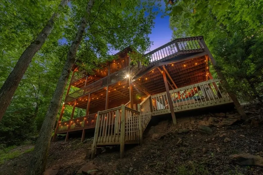 ^^ Adirondak Inspired Creek Front Chalet ^^ Sizzling with style this 4BR, 3BA lodge is known as “Rusty Creek Cabin” & located in a magical picture perfect setting w/ beautiful creek frontage nestled among 0.64 wooded acres w/ mature hardwoods & native flora galore. Spacious open floor plan w/ 1BR/1BA on the main level, 1BR/1BA on the terrace level w/ finished Recreation Rm/Den & 2BR/1BA upstairs including large master suite + open loft flex space that offers additional sleeping or flexibility of being a home office, study, etc. From the moment you step foot inside you'll be impressed with the sense of upgraded finishes throughout from the massive cathedral ceilings of the entry front porch w/ exposed beam rafters to the custom kitchen cabinetry w/ butcher block countertops including the waterfall edge butcherblock countertop on kitchen bar w/ modern style upper shelves & tile backsplash, stainless steel appliances, upgraded lighting throughout including deer antler chandelier in the GR, Adirondak inspired “mountain laurel” handrails & pickets on the staircase & more. 2 Rock gas log FP's including one in the main level GR & one in the terrace level Rec Rm/Den. Large covered porches spans entire length of home offering two levels offering the best in outdoor living including a outdoor dining deck on the main & a private hot tub deck on the terrace w/ access to your own private nature trail leading to the creek front outdoor firepit. Master suite features custom walk in “carwash” shower featuring amazing emerald green tile w/ industrial metal + glass shower panels & live edge rustic vanity w/ concrete sinks providing a really striking vibe w/ the blend of modern & warm rustic design element finishes. This property has been a successful STR/investment property & can be purchased turnkey fully furnished