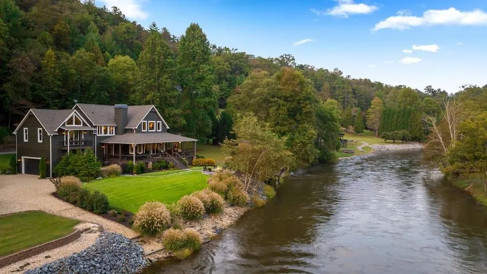River's Edge is a 6-bedroom, 5-bathroom, fully furnished home with 114' of Toccoa River frontage. It underwent a complete remodel and landscape transformation in 2020, interior designed by Cindy Trimble of Studio Trimble Design of Blue Ridge, GA. The home has 5643 (+/-) heated and cooled sq. ft., 1,400 sq. ft. of front porch, 1,600 sq. ft. of porch facing the river, 16x16 deck extending over the river, a hot tub, and rock firepit with two sets of rock steps leading to the river. The kitchen, living, and dining areas are all open with lots of counter space for cooking and entertaining. Beautiful wide-plank eastern pine floors are featured throughout, with Persian rugs and tasteful dcor that provide a sophisticated lodge feel. The home has three master suites, two on the main floor and one on the second floor. The second-floor master suite features three closets, double vanity sinks, larg...