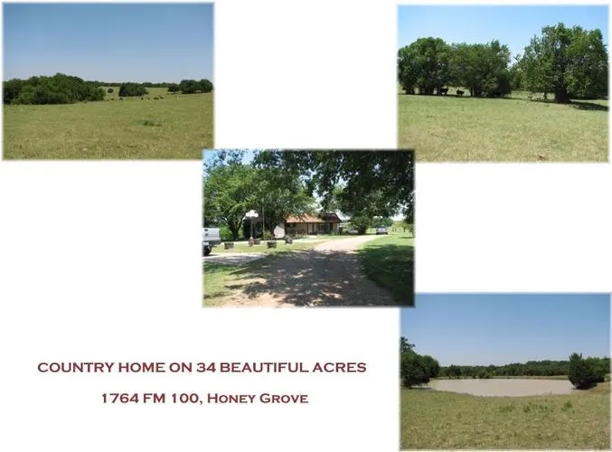 Neat and comfortable 3 bedroom, 2 bath home with central heat and air situated on 34 fenced rolling acres with trees and scenic pond. Plenty of room for additional home sites with panoramic vistas of the beautiful rolling countryside north of Honey Grove. Property backs up to city lake and golf course. Easy access to Bonham, Sherman, Paris and major roads via US Hwy 82.