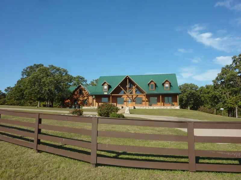 Magnificent 'Rocky Mountain' style log home, northwest of Bonham, TX, three bedrooms, 4 baths, 1 half-bath, on 730 private acres of rolling countryside. Two other log homes (4/4 and 3/2) overlook a 50-acre lake. Great room with Colorado river rock fireplace and 31-foot ceiling height. Gourmet kitchen, granite island, Dacor 6-burner gas cooktop, two convection ovens. Separate study with views of the front pasture. Large cozy master with a fireplace; huge upstairs game room. Pool and spa. Pella windows; 12KW generator; 5 zones of heat/air; 2500 gallon water storage tank. Excellent cattle land; hunting - deer, ducks, turkey and hogs. 12 ponds; 6 water wells.