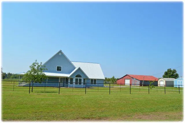 Beautiful country style home with huge wrap around porch, barns, storage buildings, 2 ponds, excellent fencing, livestock working pens on 22 acres of lush green pasture. Home features huge sun room, large living area, lots of beautiful cabinets in kitchen. Three sets of French doors and lots of windows and natural light.