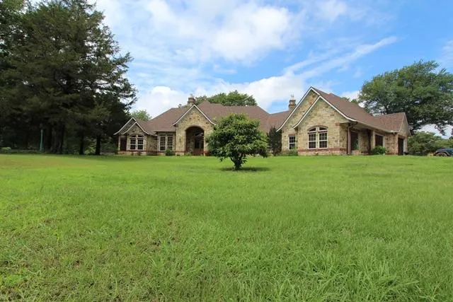BEAUTIFUL COUNTRY ESTATE ON 50 ACRES. This recently updated custom stone and brick home sits majestically on 50 acres of rolling, tree filled terrain with two fully stocked ponds and a calm meandering creek. The home elegantly boasts slate and hand scraped hardwood flooring, granite countertops, 8 ft. doors, 10-13 high ceilings, grand archways, and an automatic generator that will keep you up and running, during any power outage. The living room is absolutely gorgeous with its soaring stone fireplace, a Chicago bricked wall, custom built cabinetry, and a wall filled with floor to ceiling windows that let the beauty of the outdoors in. The kitchen is any chefs delight with two islands, two sinks, and a Dcor six burner Dual Fuel Range stove with two convection ovens. A slew of custom cabinetry fills the walls, and an eat in kitchen with enough space for all your friends and family. On the occasion that you need more room, there is a large formal dining room complete with grand doorways and large windows. The spacious master suite is a room you will never want to leave, with a two-sided stone fireplace that is shared with the master bathroom, a large sitting area, and walls of windows with phenomenal views of the north pond and countryside. The master bathroom is beyond perfection! It has the most wonderful jetted tub that you can soak in until your hearts content, while feeling the warmth from the fireplace. There is also a separate, and very impressive slate and glass shower, his and hers vanities, a private water closet, a double linen closet, and a spacious walk-in closet and room galore. On your way to the south end of the home, you will pass the beautiful double French doors that open into a large corner study. Further down the hall, you will find two oversized sunlit guest rooms with closets that have built in shelving for additional storage space. These bedroom suites share a great Jack-n-Jill bathroom. There is another spacious bathroom at the end of the hall that has access to the covered back porch, perfect access for guests while enjoying the beautiful countryside. There is an oversized three car garage attached to the home, as well as a custom designed shop. The south pond has a dock and beach for your fishing pleasure. The north pond is the perfect place to sit back and enjoy the peace and tranquility from the swing under the old oak tree. This property is the perfect combination of pasture and forest. The magnificent trees are simply incredible, and are placed perfectly amongst the rolling hills which are covered with native grasses and wild flowers.