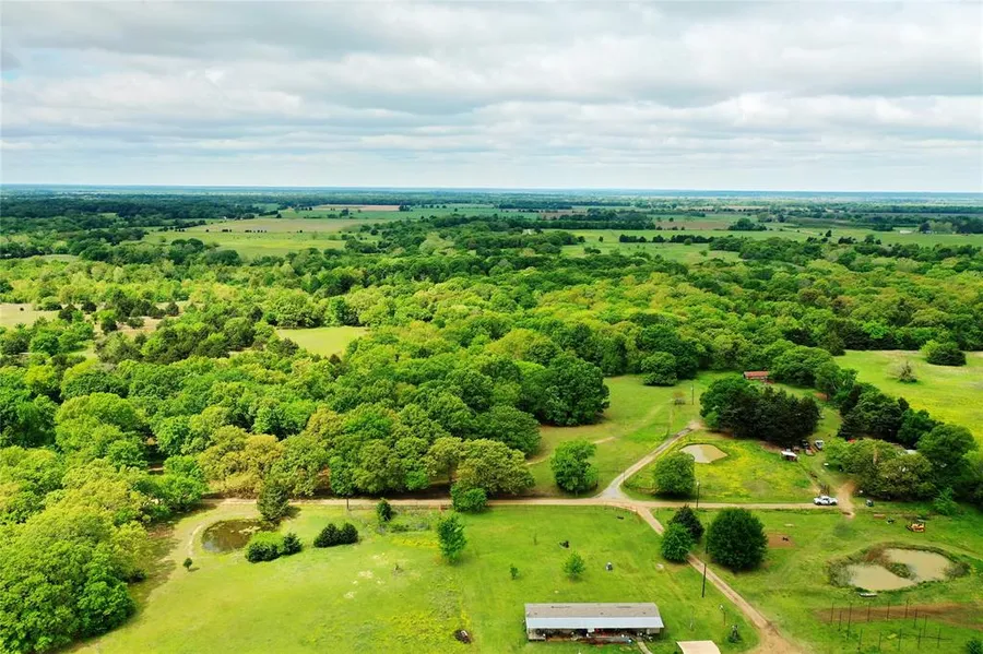 Two homes sitting on 64+ acres located 11+ miles North of Bonham. Driveway divides the property with approx 1280 sq ft farm and ranch house built on the West 34+ acres. A 2011 1280 sq ft manufactured home sets on the East side of the drive. A great mix of mature hardwood timber, two creeks, all on rolling sandy terrain covered in abundance pasture. Owners have enjoyed the well drained fertile soil, the quality of the whitetail deer and the peace beauty the property provides. Both homes have great back porch views.