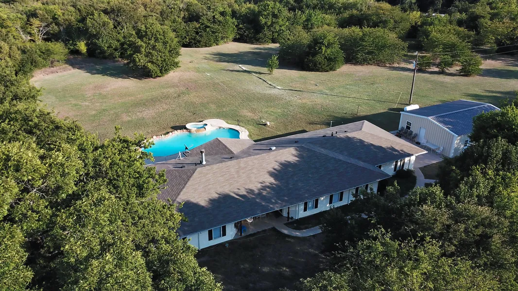 This is an 11.4 acre ranchette approx. 35 miles Northeast of McKinney, TX and about 60 miles NE of Dallas, in the farming community of Leonard, TX. It boasts a single story ranch rambler style home of 3,267 square feet, built in 2000; 5 bedrooms, 3 and one-half baths; home office, 1 large main living room, dining room and an in-law suite with bedroom, living area and full bath with walk-in bathtub. The home has a large, deep covered back porch overlooking the in-ground gunite pool and pasture. The outbuildings include a newer built metal, 4-car tandem garage and a climate controlled and plumbed 1,200 square foot guest house, of which interior construction has not been completed. The land has been subdivided and additional land is available. It has some barbed wire fencing with a fully fenced front pasture, and a partially fenced back pasture. No flood plain. No known restrictions. New Survey will be provided. BOUNDARY LINES DRAWN FOR REFERENCE ARE APPROXIMATE. 2 Freight storage containers are excluded. Call Donde at 972-658-4776 for more information.