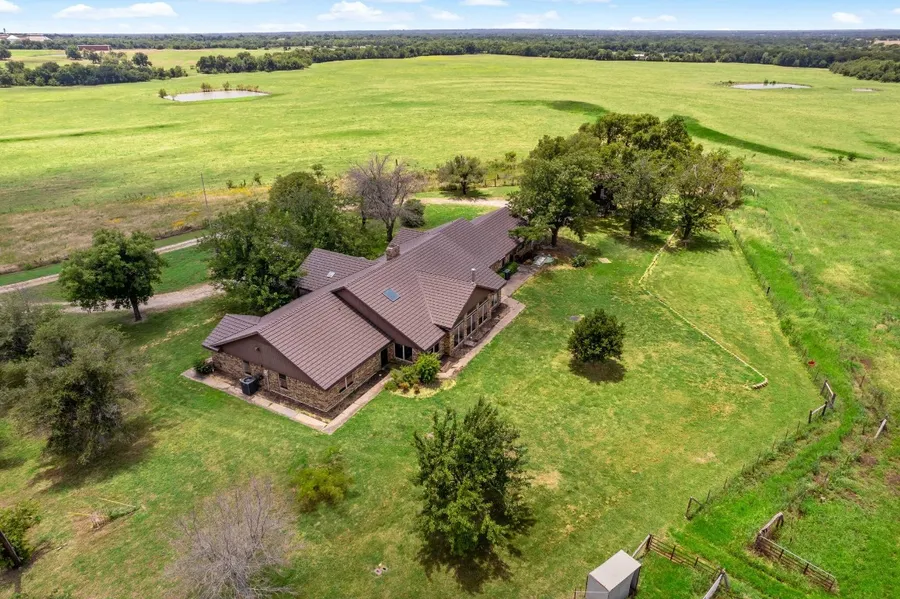 Experience the charm of a vast TX ranch home on approximately 20 acres, surrounded by serene countryside. A grand formal entry sets the tone, a spacious great room with cathedral ceilings, ideal for entertaining surronded by a stone fireplace. Abundant windows invite natural light and showcase picturesque views. Enjoy a media room, an office with scenic views, and a generously sized dining area. The open eat-in kitchen offers SS appliances, ventahood, wine refrigerator, and a pantry. The primary bedroom offers relaxation with a cedar closet and ample space for furniture. The primary bath boasts two vanities, a garden tub, and a separate shower. Guest rooms are generously proportioned, including a Jack & Jill bath. The laundry room offers extra storage and a built-in ironing board. A spacious garage-shop, equipped with water, provides room for special projects. Beautiful pastures for live...