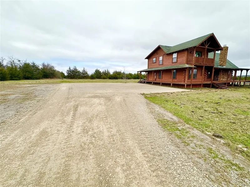 Bring your horses, goats and livestock to this fully fenced, Ag exempt, 37.6 acre property with over an acre of pond fed by nearby creek and zero floodplain! Acreage is 100% useable land including pasture along with heavily treed areas. Brand new $15K entrance road in 2025! A short walk from the cabin leads to a 3700 square foot metal barn, which can be used for equipment storage, and also has an area specifically for animals. The barn comes equipped with two garage bays and a built-in tack room with electricity and a water line. Pipe fence riding arena, located directly next to the barn, for horse training, riding, and roping. Concrete RV pad for parking. Sip your morning coffee on the covered, wrap-around porch as you soak in the serene views. The front entry opens to a spacious open floor plan with rustic luxury at its best, featuring cathedral ceilings, real wood walls, doors and beams, real hardwood floors, and light fixtures with lavish country design. A large stone wall in the living room houses a wood burning fireplace with gas starter and a raised hearth. The eat-in kitchen includes an undermount hammered copper farmhouse sink, redwood cabinets, leaded glass cabinet with hanging stemware rack, pot and pan drawers, and granite countertops. Off the kitchen is a spacious dining room, centered with a wagon wheel chandelier, and showcases soaring windows with views of the pond and pasture. Glass French doors lead from the dining room to the back deck. The first floor primary bedroom offers ample space for a sitting area, windows that overlook the property, and an en suite bathroom. A wooden log staircase leads to the upstairs loft or family room, perfect to watch movies, play games, or could serve as an office or a play area. The second floor primary bedroom features a balcony deck and a luxurious en suite bathroom. Perfect for vacationing and getting away from the hustle and bustle of city life, yet the property is only a quick 45 minute drive to McKinney.