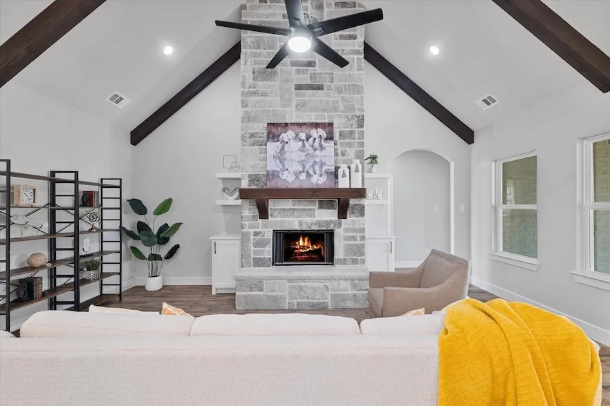 INCOMPLETE Custom-built masterpiece boasts stunning open floorplan with 30X50 Electric Workshop. NO HOA on Acreage. Step inside to find soaring cathedral ceilings, rich wood beams & magnificent quartz stone fireplace. Luxurious master suite offers a spa-like bathroom complete with frameless glass shower sleek modern tile, & dual quartz sinks. Enormous built-in closet provides lots of storage space. Open-concept kitchen, features large walk-in pantry, trendy backs plash, elegant quartz countertops, shaker cabinets that extends to ceiling with glass upper cabinets & back lit lighting. Situated on over 1.396 acres, offering a serene country setting with mature trees, providing plenty of room for kids to play, family gatherings, or relaxing on the huge covered patio. Experience a perfect blend of luxury & tranquility in this modern farmhouse. Built with the highest energy efficiency in mind, home includes encapsulating foam insulation & sits on a durable peered & slab foundation, ensuring long lasting quality & comfort. ***Photos are representation as home is UNDER Construction***