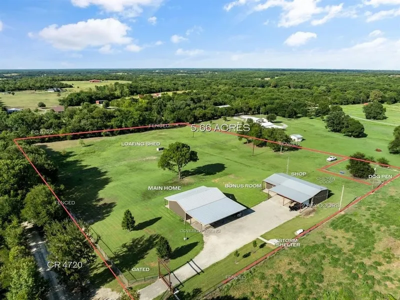 Land, Home, and Shop... This Property Truly Has It All! The drive home is filled with scenic country views & the only traffic jam you are likely to experience is the occasional tractor headed to the neighbor's field. Pretty 5.6+ acres is fully fenced, the lush natural tree line creates a depth of privacy. The gated entry is your first hello & the first glimpse of the flagpole. The furling red, white & blue flag has long been a staple here, the sellers will leave for the next owners to enjoy. The rustic barndominium is pretty, with deep, rich chocolate tones, stone accents, BIG porches & a recent covered parking extension, offering a great amount of covered parking. With open views, the living, dining & kitchen areas create an inviting space to enjoy daily living or accommodate a crew of your favorite people. This low maintenance, versatile home features an eye-catching kitchen with a fantastic island, built in wine rack & amazing light fixtures that showcase the farmhouse style. The primary BR is filled with natural light, the ensuite is convenient & full of charm! Two additional BR & a full bath. A detached 600 sqft game-flex room is outstanding for parties, watching the game, comes with a standard pool table & shuffleboard game, impressive tall ceilings, loaded with personality! The multifunction 1200 sqft shop is perfect for car enthusiasts, ranch equipment, storage, foam insulated work space with additional covered parking. Great overhead lighting, the incredible wood burning stove keeps it cozy! Property is cross fenced & livestock ready. The loafing shed, chicken coop & expansive dog pen make country living easy! The recently added inground storm shelter is top of the line. Great location, the serenity here will make you never want to leave home. When you do, it' a destination to hurry back to every single day. Minutes from the new Leonard ISD Elementary, High School & sports facilities. Easy commute to McKinney, Sherman & DFW airport.
