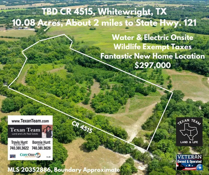 This 10.08 acre tract is a rare find in a prime location. You are just a few minutes to US Hwy 69 and about 2 miles to the new State Highway 121 for an easy jump into McKinney, DFW or Interstate 75. Plus you are convenient to Bonham, Bois D'Arc Lake and about 20 minutes to the Texas Instruments corridor near Sherman. A water meter has been installed, electric is present, and a new survey is in hand. Bring your home or barndo plans and build now or hold for an investment. The tract a mix of pasture and woods, is Wildlife Exempt, fenced on 3 sides and Fannin County taxes are reasonable. The woods and field make for exceptional wildlife habitat and this land has a history of holding big whitetail bucks, as the owner has practiced quality deer management, look at the pictures. Some flood plain, and an adjacent meandering creek, in the rear of the tract, is present and makes for really nice trees. Gentle deed restrictions are proposed. Graphic boundary is approximate. Information deemed reliable but buyer should perform due diligence.