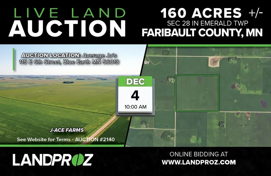 160+/- Acres located in the S of the SW of Section 28 in Emerald Township in Faribault County, MN