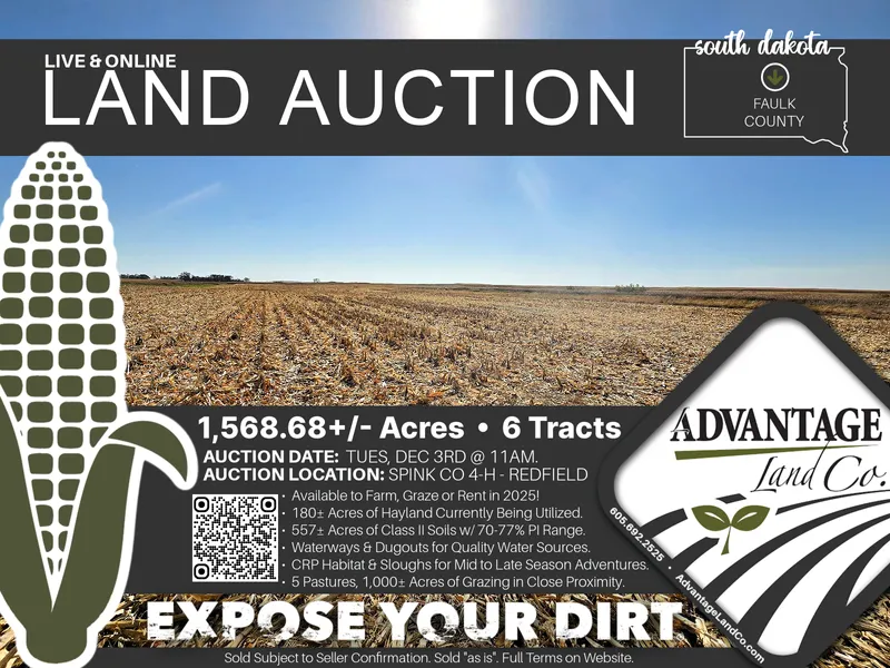 Farmers, ranchers, and investors alike, appreciate the abundant opportunities this land provides! Let your roots grow deep in Faulk County, just minutes northwest of Redfield, South Dakota, with 1,568.86+/- acres at auction proudly presented by Advantage Land Company. All located within 5 miles, this property is comprised of grassland, hayland, cropland and CRP that has been owned and well stewarded by the Jungwirth Family for more than 70 years. Between the 5 pastures, suitable fence lines and water sources, this property is perfect for grazing your herd in close proximity with a span of about 1,000 acres of grass. There are 557+/- acres of Class II soils generating a soil productivity index between 70% and 77%, with a 55% index across all the acres the land encompasses. FSA reports a total of 513.21 Cropland acres with 273.52 total base acres comprised of an 82.57 acre Wheat base, an 84.18 acre Corn base, an 84.39 acre Soybean base, a 16.3 acre Sunflower base, a 1.88 acre Sorghum base, a 1.10 acre Barley base, and a 3.10 acre Oat base. This property has a unique balance of grain, grass and slough acres attracting a plethora of wildlife, including waterfowl, upland game birds and whitetails! Enjoy the benefits the infinite variety brings to the land. Bid to buy December 3rd!