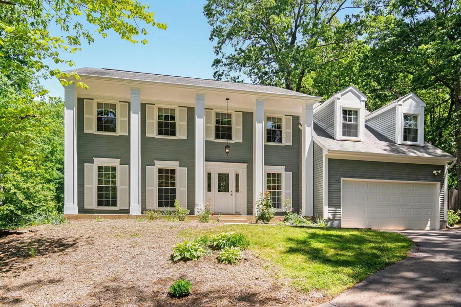 Thoughtfully set on a prominent hilltop location, your approach rises past attractive landscaping with stacked stone walls to a dramatic view of the home's five soaring pillars and broad covered porch. This residence is undeniably impressive, yet retains a gracious warmth that is welcoming and comfortable. Once inside you find a collection of spaces on the main level that have been beautifully maintained and provide a comfortable flow for both quiet relaxation and memorable entertainment. The upper level offers a coveted 5 bedroom arrangement with one of those spaces accessed through the hallway and primary bedroom, allowing it to be used as a home office or fifth bedroom. This level is highlighted by a grand primary bedroom which is a light-filled private retreat. The lower level is smartly divided with a casual rec room and two storage spaces. Behind the home you will find a generously sized patio that draws you outdoors and provides access to the upper lawn, which has been fully enclosed with 6ft board-on-board fencing, creating the perfect safe space for active pets. The grounds, well exceeding a half acre, also include a sprawling lower lawn with an expansive open area ringed by mature trees. In recent years, the kitchen appliances have been updated, as has been the washer and dyer, HVAC system, water heater, and garage door. To proactively protect the home, the main water line has recently been replaced, an expansion tank was added to the water heater, and a water pressure regulator was installed. And to prepare the home for its future owners, the majority of rooms on all three levels have recently been painted, the floors have been professionally cleaned, and the exterior has been addressed with painted trim and cleaned siding. Taken together, the many attributes of this remarkable home truly make it a rare opportunity.