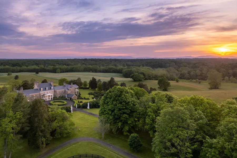 The extensive primary suite includes adjacent sitting rooms and a kitchenette, complemented by a stunning terrace overlooking the rolling hills and pastures. North Wales features eight residential tenant dwellings, including an exquisite carriage house with a five-bedroom apartment, horse facilities, tranquil ponds, and sweeping views of the Blue Ridge Mountains.