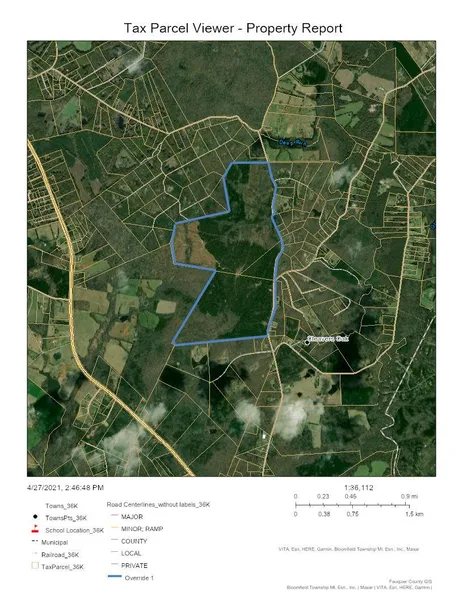 Property includes three tax parcels totaling 583 acres. Two of the parcels, 231 acres and 319 acres, are also being offered separately (see VAFQ167132 and VAFQ167134). Property is nicely rolling, heavily wooded in some areas, cleared in other. It has a mile and a half of frontage on hard surfaced, paved, state road and has Subdivision Potential Letters for all three parcels, 27 lots total. Perfect in present condition for hunting (turkey, whitetail deer), camping, horseback riding four wheeling, or just getting out and enjoying nature. Would be perfect for a hunting preserve, or could be cleared for orchards, or vineyards. Suitable for residential development or numerous commercial possibilities.