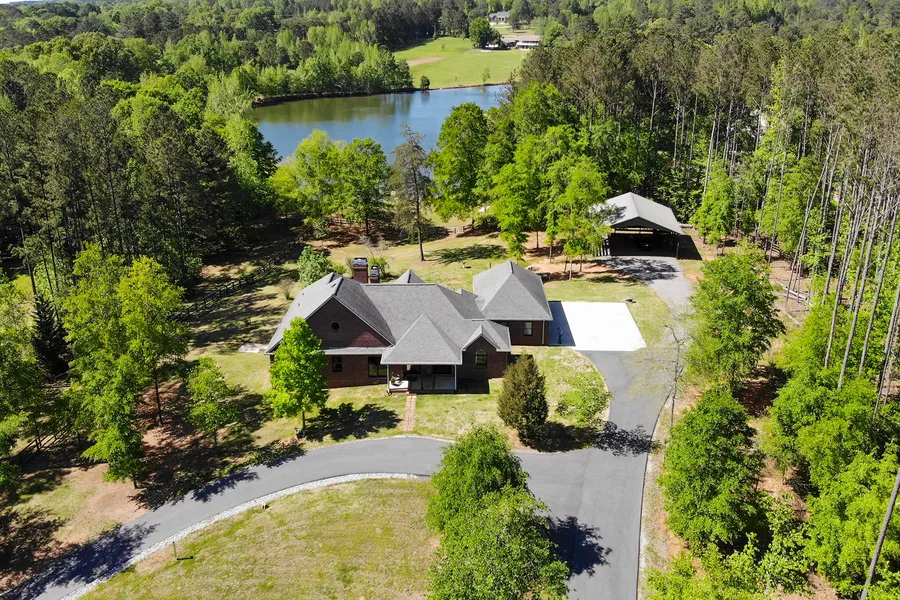 Once-in-a-lifetime views in sought-after Turtle Cove. This one-level, renovated ranch home is on 5+/- acres with a private lake shared with seven other homes. Breathless lake views with rolling hills from every window make this gated home at the end of a cul-de-sac an oasis from the hustle of the city while still being close to so much. All brick home with front and back covered porches, circular driveway, and additional third driveway to parking for an RV, 40x40 pole barn with power, and a three-car garage! Home interior has open living room, three bedrooms, a separate office with antique doors, modern white kitchen with quartzite countertops, Fisher-Paykel appliances, nine foot ceilings, open staircases to unfinished walk-up attic and full basement. The panoramic views from every room will blow you away! A wall of glass doors leads to the AZEK deck that stretches from end to end of the back of the house with a covered portion makes this an ideal place to enjoy sunrises, morning geese on the water and afternoon barbecues. The property also has a dock that leans into Lake Arnall.