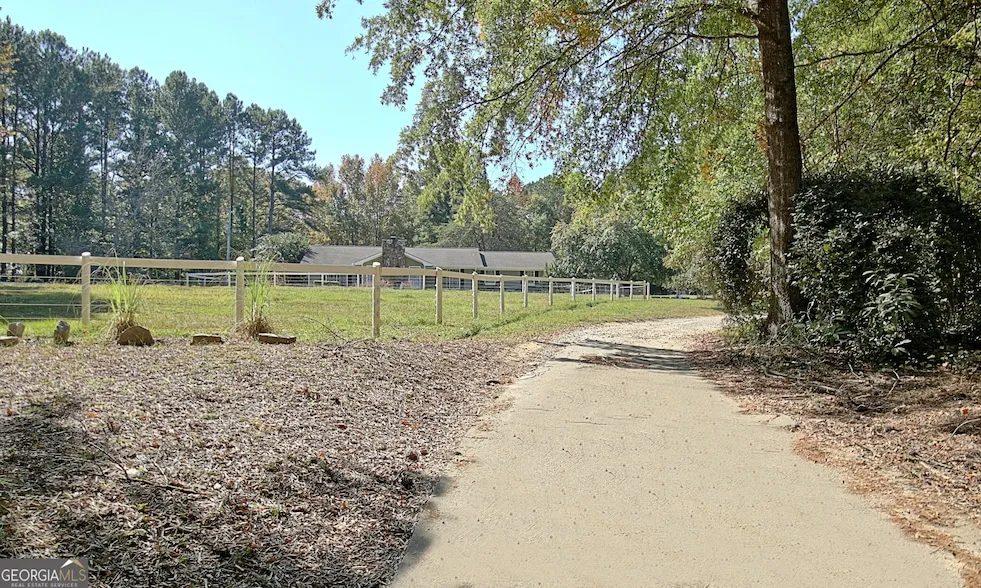 Nestled on a tranquil 3-acre lot, this charming 3-bedroom, 2-bathroom ranch offers the perfect blend of privacy and convenience. Located just half a mile from Trilith Studios and less than a mile from the exciting new USA Soccer Center, this home is a hidden gem for those seeking a peaceful retreat close to it all. Inside, the split-bedroom plan provides both comfort and privacy, with new luxury vinyl plank (LVP) flooring in the living areas, bathrooms, and the owner's suite. Fresh paint throughout and newly repainted exterior trim give the home a fresh, modern feel. All windows are set to be replaced, ensuring energy efficiency and enhancing the home's bright, sun-lit atmosphere. The open living and dining areas flow seamlessly into a galley kitchen, making this space ideal for both entertaining and day-to-day living. Outside, the property features front and rear fenced paddocks with wood posts that have tapered tops, complemented by equestrian-grade Cameo monofilament fencing, crafted in Blairsville, GA. Known for its superior safety and ease of maintenance, this fencing offers open sight lines, adding to the beauty and functionality of the property-perfect for horse lovers or anyone who enjoys wide, uninterrupted views. The home sits back from the street, adding a sense of seclusion, and the attached 2-car garage includes a bonus storage room for added convenience. This home also boasts an original Geo-Thermal loop system, giving eco-conscious buyers the potential to lower energy costs. A slice of paradise in a prime location, this property offers the perfect balance of privacy, space, and proximity to local amenities. Don't miss this unique opportunity!