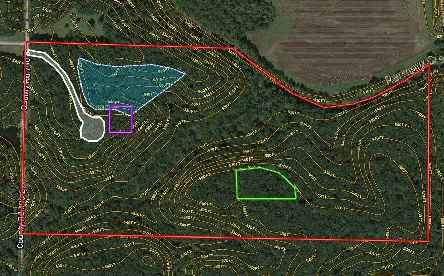 See the map for an example of a suggested set up. Blue is a possible 3-4 acre lake, purple is a cabin site sitting on the lake and overlooking a beautiful valley, white is driveway and trails, green is food plots!