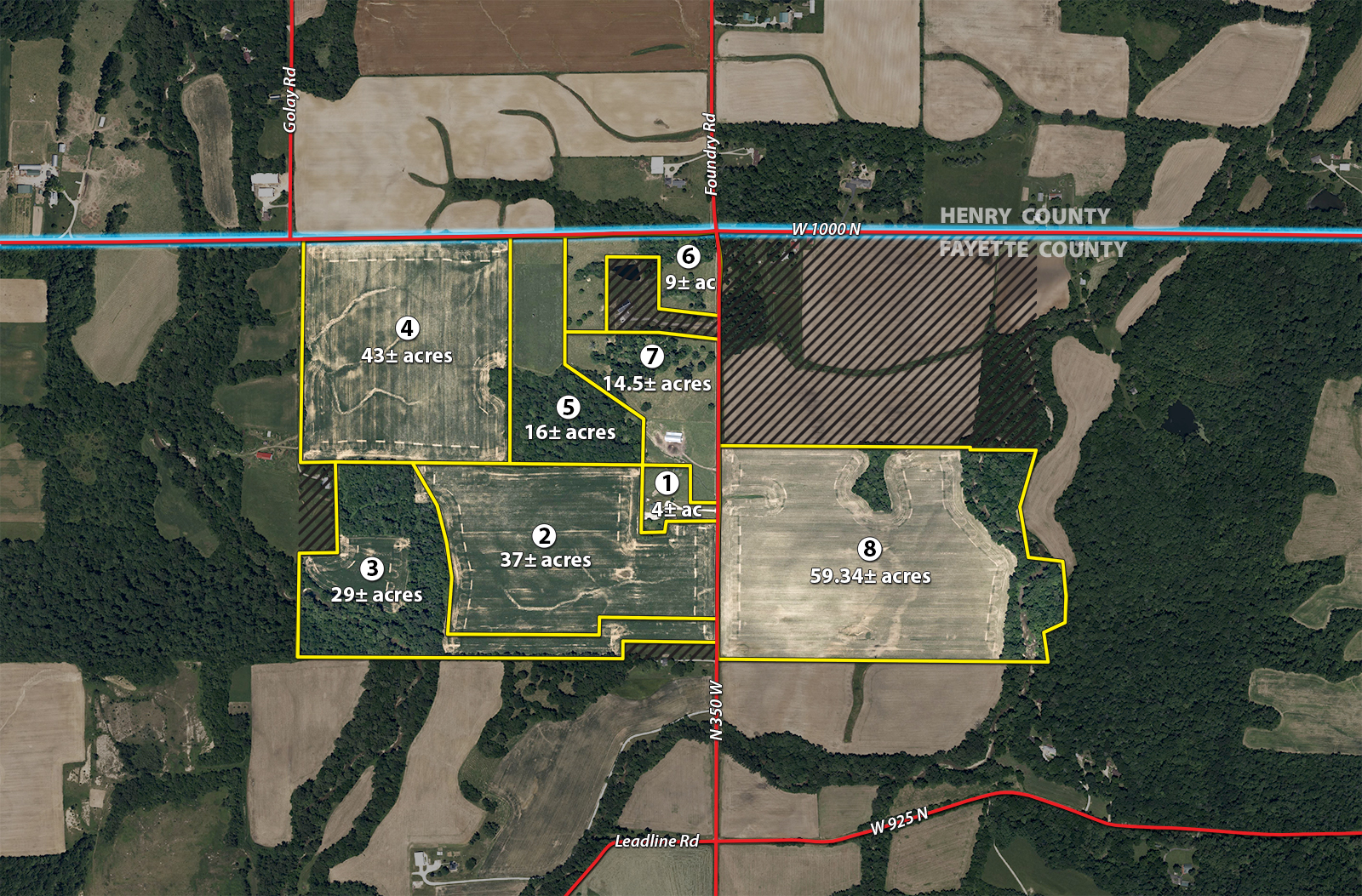 From Cambridge City: Travel West on US 40 1.5 miles to Dublin, turn South on Foundry Road and continue 2 miles to the farm. The farm has frontage on N. CR 350 West (Foundry Rd.) and W CR 1000 N (Wagner Rd.).