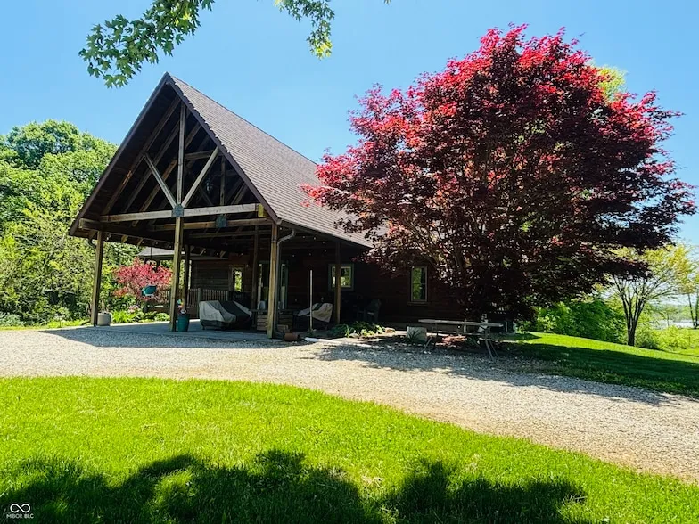 Charming Custom-Finished Log Home on 11 Acres with Guest House & Trails. Nestled in the heart of serene countryside, this custom-built 2 BR, 2 BA log cabin blends rustic charm with modern comfort. Set on 11 private acres, the home welcomes you with a spacious open layout, large windows, and a wraparound deck and patio- perfect for entertaining or unwinding in nature. The main level features a primary bedroom with double closets, access to a beautifully updated full bath with a tub/shower, and a convenient laundry room. Upstairs, a cozy loft overlooks the living and dining areas and opens into the 2nd Bedroom and a full Bath. A separate guest suite, 1BR/1BA, off the garage offers versatile use- as a home office, guest quarters, or income-generating rental. This 11 acre property includes a large yard, tranquil streams, and a scenic trail system that winds through rolling woodlands, providing a nice hike outside your back door. 20 minutes to Brookville Lake/Egypt Hollow Boat Ramp. See this beautiful home before it's gone!