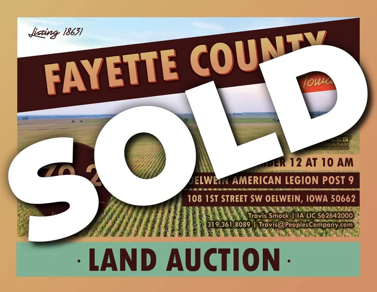 The auction will take place on Wednesday, November 12th, at 10:00 AM at the American Legion in Oelwein, and the property will be sold through the "Buyers' Choice Auction Method," as three tracts on a price-per-acre basis. Tracts will not be offered in their entirety at the conclusion of the auction. The live auction will be available for viewing and bidding through our mobile bidding app for those who are unable to attend. Don't miss the chance to bid on this land that has not been available to the general public for well over 50 years. The farm is located in Sections 32 and 33 of Jefferson Township, Fayette County, Iowa.