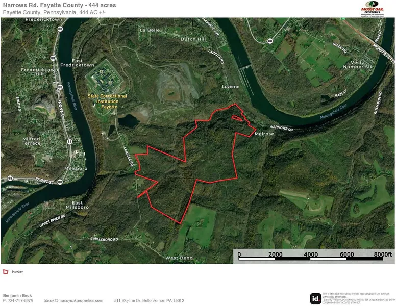 This 444 +/- acre tract is in East Millsboro, PA and can be accessed from Labelle Road or Narrows Road. The property is located a short 20-minute drive from Uniontown, minutes from toll road 43 and an easy commute to the city of Pittsburgh. The property is highlighted by excellent access throughout, areas of mature timber and a beautiful creek that traverses the property. Large parcels in SW PA are rare and this property is a secluded sportsman's paradise, ideal for hunting, camping, off-roading, horseback riding, conservation, etc. Excellent access throughout the property via the gas well road system that is used to service the 13 shallow gas wells. The gas well field are ideal for food plot development. The property has not been entered into Pennsylvania Clean and Green program which would save considerably on taxes.