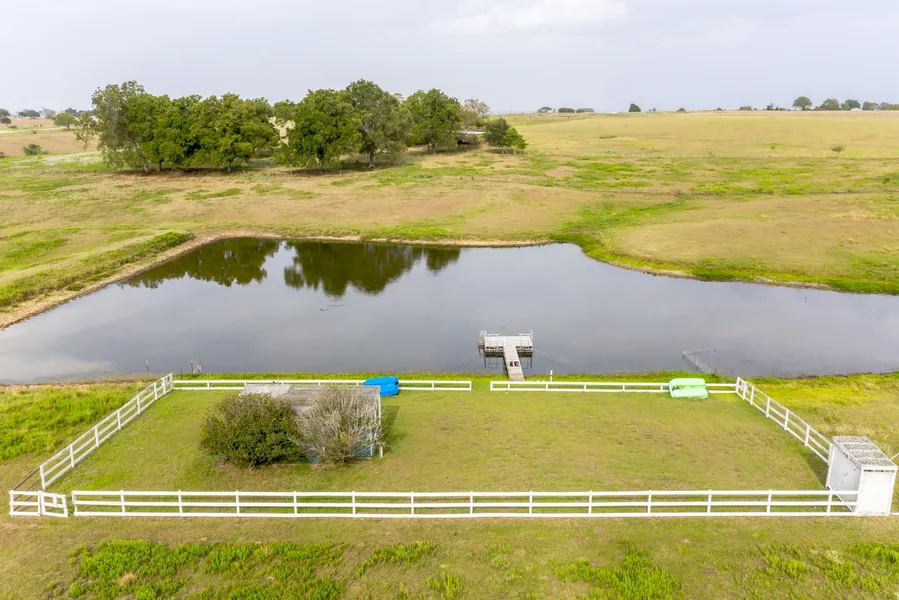 2016 built 3/2 country home at 425 ft altitude providing panoramic views of the beautiful surrounding countryside! One acre spring-fed, stocked pond with floating dock and screen shaded picnic/sitting 12x24 gazebo with fenced grassy surround. Home has awesome 2260 SF covered porches for relaxing in the country breeze. 480 SF TX style carport-roof only. Playscape area for kids and outdoor party area with firepit all shaded by large live oaks. Property is wonderfully landscaped including a newly planted, producing, fruit orchard! Property has new water well but also a county water line at front of property.