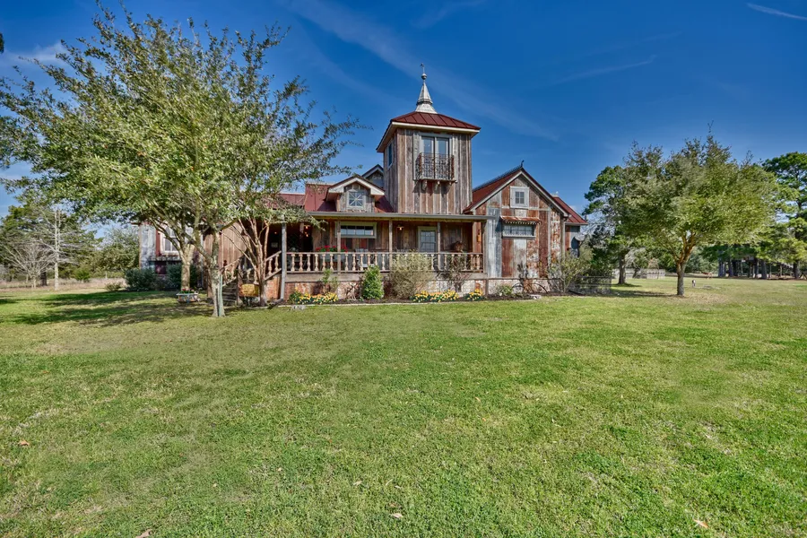 The early 1900's 2B/2B cottage footprint was expanded with added vaulted ceilings. The exterior veneer is a combination of metal and wood from old barns, stamped metal skirting, antique porch railings; and on top ornate ridge caps and a lovely church steeple. The main home offers a spacious living room, dining room, & modern gathering kitchen set beneath a double-height, beam-truss ceiling. Rustic reclaimed wood floors, fireplace mantel, walls, windows, & door frames retain vestiges of old paint; glass chandeliers encircled with lighted reclaimed tin; & old pulleys repurposed as pendant lighting above the kitchen island. An 18'x20' master bedroom with chandelier lighting offers a pair of walk-in closets & a modern bath. There are two bedrooms with en suites & one additional guest room. Just out the back door you'll find a vaulted porch and lots of deck space surrounding the pool with nearby cabana. In the near distance a fun heated/cooled tree house. The Sellers have recently renovated three grain silos into standalone cottages. Each unique with varying finishes, fabulous light fixtures, tiny porches and full bathrooms. A fantastic and charming old barn topped with several cupolas sits just behind the farm truck turned chicken house! Located on the Texas Antique Corridor this property is just 60 miles to Austin Bergstrom Airport. A whimsical property that celebrates life in rural Central Texas.