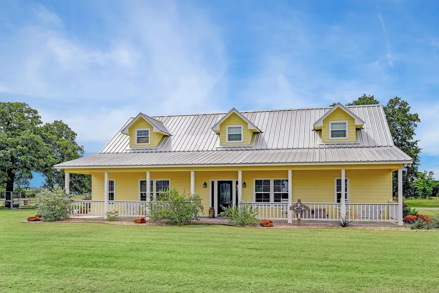 The lovely home was built in 2011 and greets you with a full-length covered front porch perfect for greeting your guests and enjoying a refreshing drink while overlooking the pretty pasture scattered with grand oaks. Home features 3 bedrooms, 2 full baths, open concept living - dining - kitchen with French doors to a patio, all perfect for family living and entertaining. Large master suite with high ceilings, room for a sitting or desk area and master bath with large soaking tub, separate spacious shower with walk-in closet and additional generous storage. Two more downstairs bedrooms and spacious utility/laundry room complete the downstairs. Upstairs is a sizable flex space which could be a family room, media room, or extra bedroom.