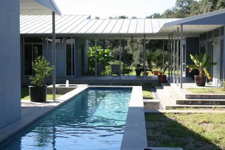 A once in a lifetime opportunity to own, a fabulous live oak covered property with a beautiful contemporary home. This 17+/- acre property with its architectural digest home is located in a premier area of southern Fayette County. A paved driveway lined with magnificent live oaks leads from the county road up to the house. The house is set back into the property and is not visible from the road, which affords seclusion and privacy. The home, which was designed by Webber-Hanzlik, an Austin architectural firm, was built in 2000. Built around a quadrangle, the unique structure with its standing seam metal roof, is clad in Hardi plank stucco board, galvanized metal and stainless steel, and consists of a main dwelling with one bedroom, living room, kitchen, dining room and 2 baths, and across the quadrangle, a guest quarter with a bedroom, bath and art studio, which was built with windows to catch the north and east light. The living quarters feature stained concrete floors with lots of windows-floor to ceiling. Sliding doors open onto the complex, connecting each of the buildings. Storage and a two-car garage complete the quadrangle. Sidewalks connect each building, and a lap pool and fire pit are in the center of the quadrangle. Fruit trees and a garden area complete the yard.