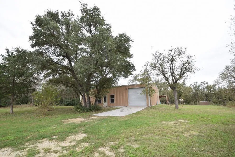 12.028 wooded acres with 2 bedroom barndominium. Living, dining and kitchen are all open area. Custom interior wood finishes done by individual craftsman. Drive through overhead doors on one end with laundry, storage area and room for a workshop or for big boy toys. Land is under wildlife exemption. Two ponds, larger one stocked with fish has a pier on it for fishing. Shooting range on property.