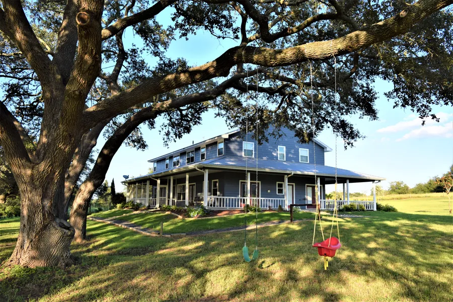 Custom built farmhouse with panoramic views on all sides. Majestic 150-yr old oaks on property, property is Ag Exempt. Home is constructed of Hardi-Plank and freshly painted. Wrap around porch on 3 sides with 250 SF screened-in back porch. Kitchen with L-shaped bar that seats 6 plus a walk-in pantry, granite counter tops and stainless steel appliances. Dining/living combo area with built-in bench seating with storage. Two sets of French doors lead to either the covered or screened-in porch. Pocket doors divide the study from living area. Master bedroom has his and hers bathrooms, walk-in closets. Laundry area with storage cabinets/closets, plus an extra room for dogs and a dog door. Huge living area upstairs with built-ins. 4 large upstairs bedrooms with 2 full baths. Small cute house in back for tool storage which could be a kids playhouse. Other out buildings include 6x10 storage shed, pump house. In 2011 the land was fenced and cross-fenced with corral board (painted). A 3/4 acre pond was built intersecting 3 pastures ranging from 3 1/2 - 5 acres each. Pastures were plowed and planted with coastal Bermuda grass. The soil is productive and being used as improved hay fields. There are irrigation lines to the pond to reclaim rainfall from the roofs of the house & barn. Many newly planted plants and trees are supported by irrigation. 3/4 acre garden w/high fence to protect from deer. Freshly painted 2,600 SF barn/stable built in 2011 with electric, septic, plumbing. 4 (12x12) horse stalls. Separate rooms for tractor and equip, tack room w/ac, feed, plus storage room. 10 ft wide aisle separates stalls from work rooms, with an overhang outside the stalls adjacent to a small corral between barn and pastures. Stalls have dutch doors opening to the overhang into corral. Overhang also has a wash area. There is a separate air conditioned gameroom/living area with sink, bathroom. Surrounded by 10 ft wide porches on 2 sides with 2 huge oaks for shade.
