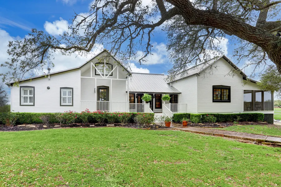 1800's farmhouse and new modern guest house ideally situated on 10 +/- acres overlooking a pond with fountain, live oak trees, and fields of bluebonnets! Sophisticated home was restored in 2008 with no detail left undone, wood floors, walls, and ceilings! Great entertaining kitchen that flows into a gracious living area that opens onto a large screened-in porch. Primary bedroom is downstairs with a spa bath, double vanities, walk-in shower and huge closets! Upstairs, there are 2 bedrooms, a bunk room, and a sitting area. The 2300 sf. guest house features a spacious living/dining room with views of the property! It has a full kitchen, laundry, and half bath downstairs. There are 2 more bedrooms, a full bath, and a sitting room upstairs. The pool with rock waterfall, pergola by the pond, and garage complete this perfect picture! Very desirable location, 6 miles to Round Top and large game ...
