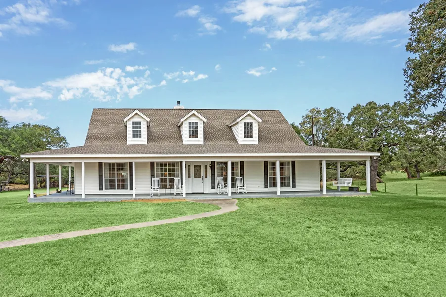 3 bed/ 2.5 bath 2,440 sq ft ranch style home situated on 82.68 acres of rolling land with beautiful mature oak trees and 3 ponds. Wonderful views of open pasture, dense trees, sunrises, and sunsets are available from the 1,520 sq ft wrap around porch. The property has complete road frontage on the East (front) and North sides. The land is cross fenced, each section with its own pond for rotating and managing cattle. A wonderful barn with working pens adorns the property. 8 minutes from La Grange, 30 minutes from Round Top, 14 minutes from Flatonia. Come experience this ranch on an ATV tour!