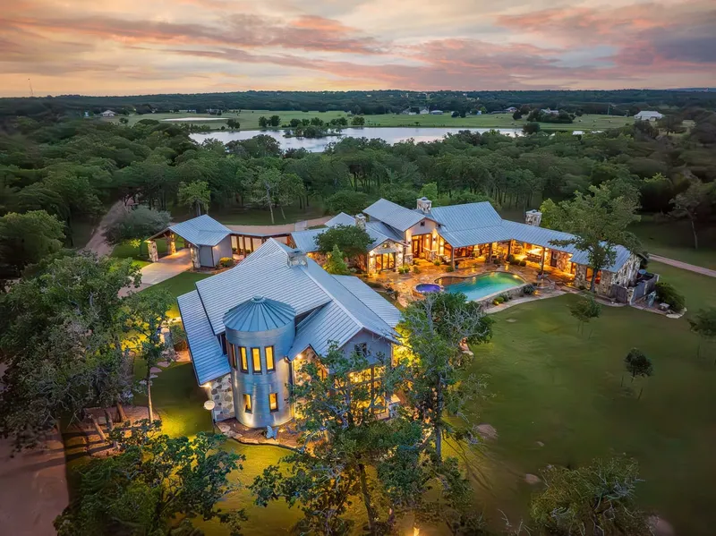 Nestled amidst the serene beauty of mature oaks and panoramic views, the entrance to this 90-acre ranch is marked by a majestic driveway, bordered by pristine white fencing that meanders past an 8-acre crystal-clear lake, setting the tone for the grandeur that awaits. As you approach the heart of this meticulously curated estate, crafted by the renowned Rick Burleson Architect and design firm, it becomes evident that every inch of the property celebrates a symphony of rustic elegance and modern sophistication.