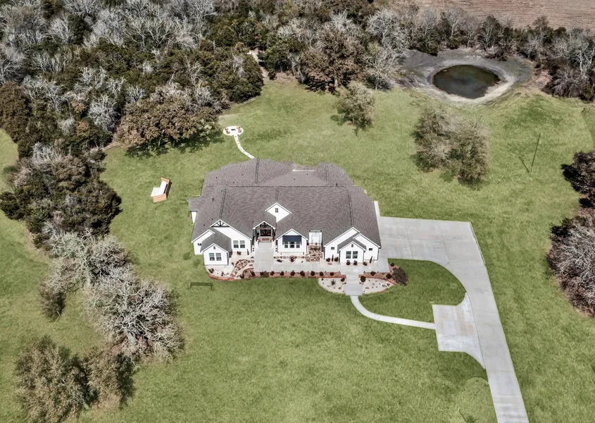 Travel past the gated entrance approximately 1/3 of a mile to discover the refined 1-story ranch home situated on 35-acres of prime Texas land. Custom built in 2023, this home and property are a rare opportunity for those seeking rural serenity. The main residence has beautifully designed interiors that include the latest in style and luxury. The moment you enter the grand front entry, you will understand that every detail has been carefully considered. Elegant craftsmanship is on display in the inlaid tile flooring, custom mill and stone work, and the thoughtfully designed floor plan. High ceilings, wood beams, and floor to ceiling windows add to the feeling of airiness. Stunning light fixtures throughout the home are delightful additions to the home's uniqueness and ranch chic flair.